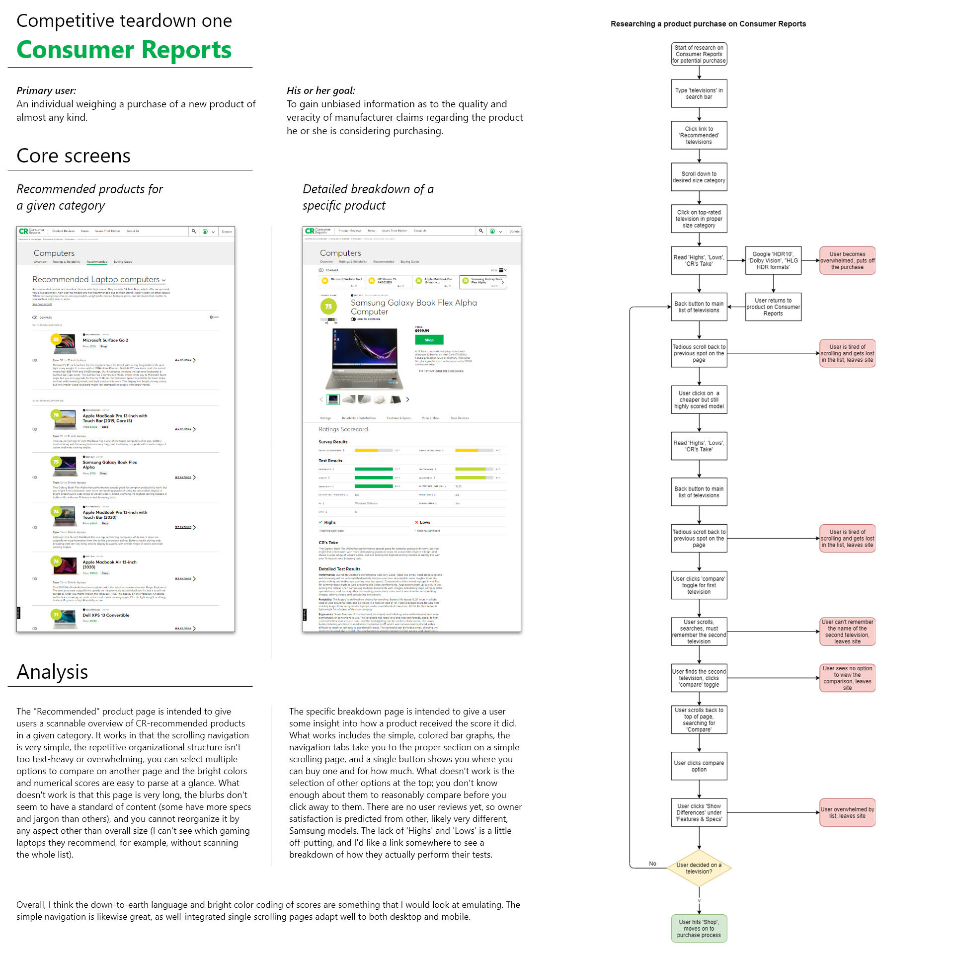 A competitive teardown of core screens, and a task flow for researching a product purchase on Consumer Reports.