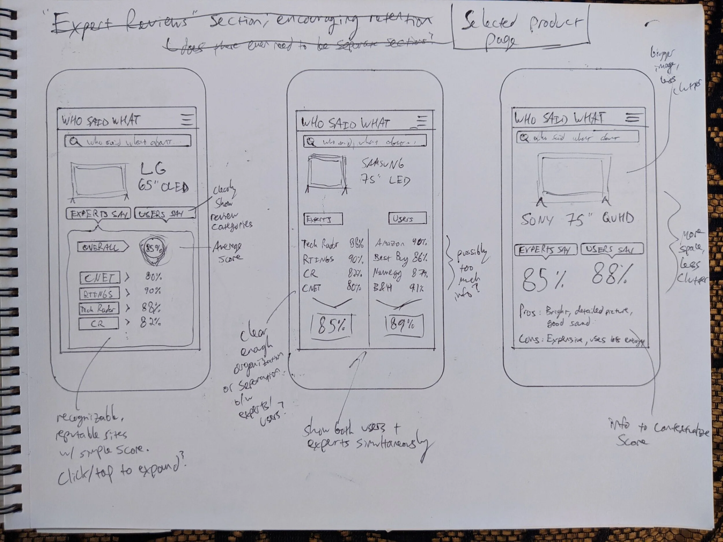 I looked most closely at Consumer Reports Best Buy to get an idea of how users are presented with review content, and how those sites worked in terms of navigation. I was able to latch on to some aspects of these sites I wanted to incorporate, such as approachable language and simple scoring, but also some that I wanted to improve upon, such as navigation.